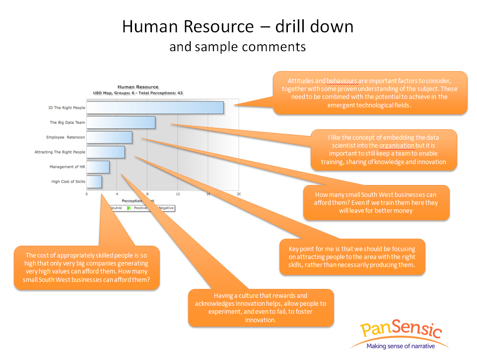 Following the event, in-depth analysis drilled down into each of the themes and a series of PanSensic lenses was used to reveal even more. The PanSensic Mercury lens, a way of looking at “personality essence” revealed the lack of Big Data Champions and Route Finders. Big Data Champions and Route Finders help create a virtuous circle – open to change, embraces the cost benefit analysis and leads to a greater understanding of the value of Big Data, and so on.